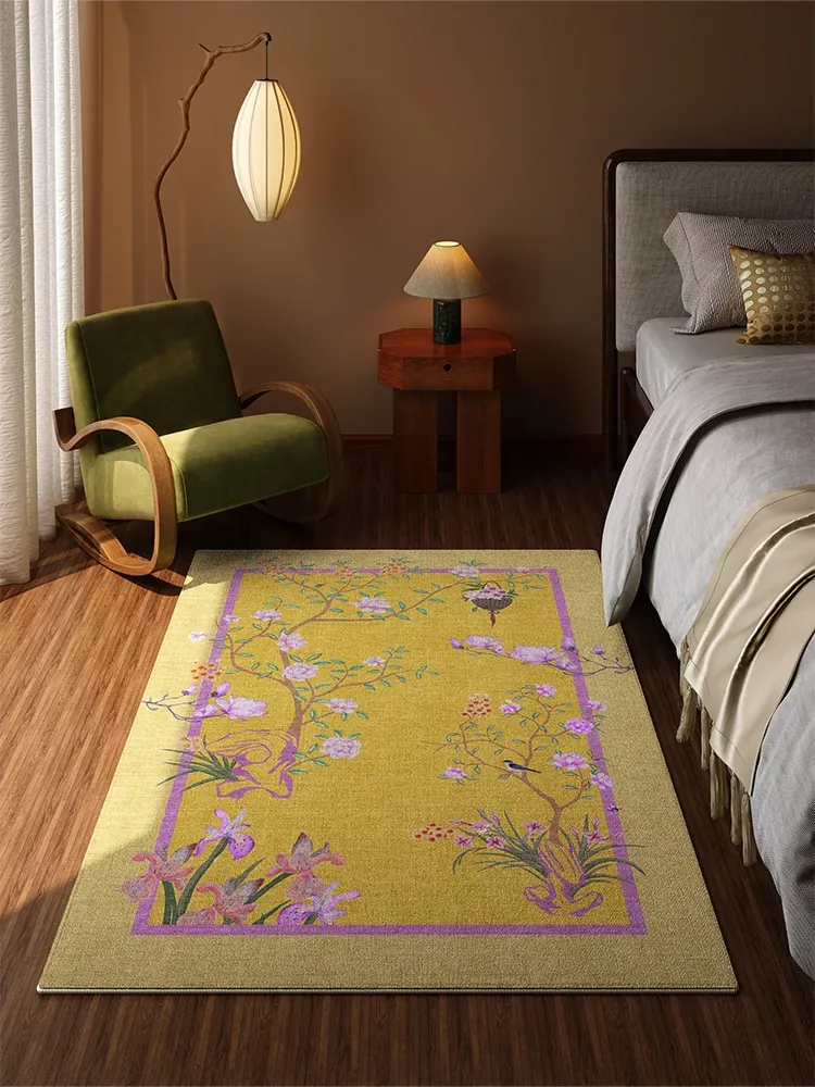 RUGオリジナルデザイン イエロー新中式ベッドルームカーペット ベッドサイドマット 高級ヴィンテージ 主寝室用 洗わずに使える防水マット