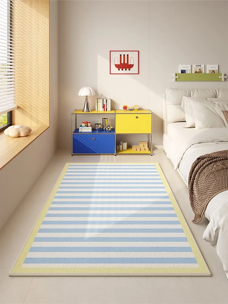 RUGオリジナルデザイン!ブルーストライプのクリーム風寝室ラグ、ベッドサイドマット、高級主寝室にぴったり。お手入れ不要の便利なフロアマットで、快適な空間を演出!