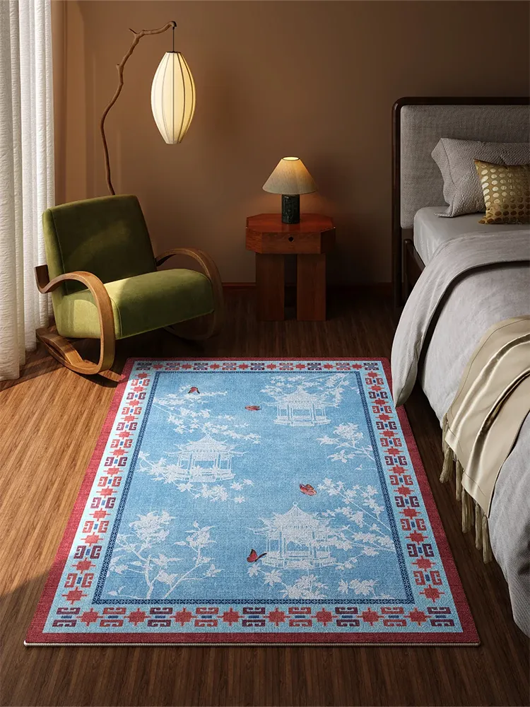 RUGオリジナルデザインのブルー・レトロ風ベッドサイドカーペット|高級感溢れる新中式スタイル|お手入れ簡単な主寝室用マット